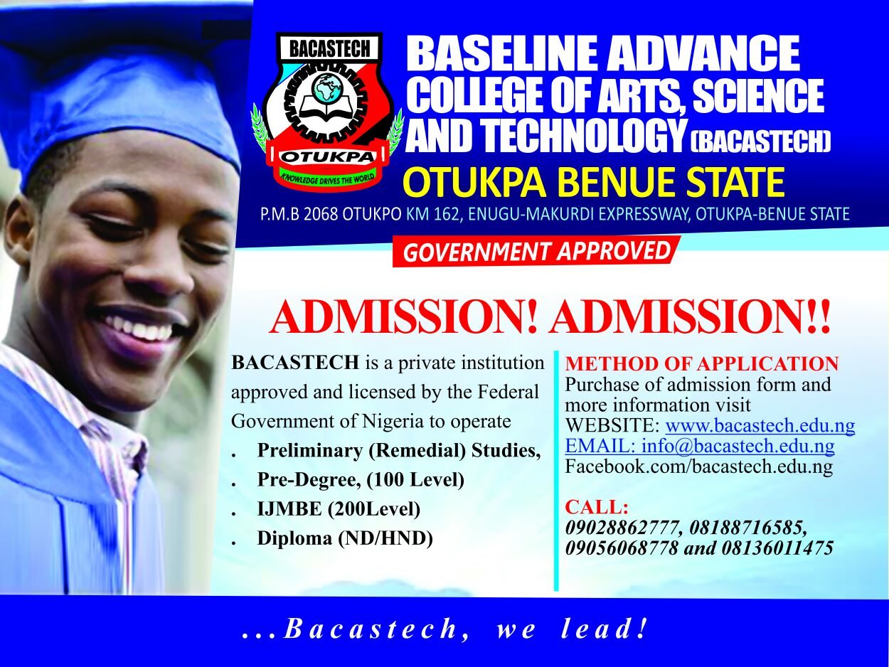 Baseline Advance Collegeof Arts, Science and Technology (BACASTECH), Otukpa in Ogbadibo Local Government Area of Benue State invites Applications from suitable qualified candidates for admission into Preliminary, Pre-Degree, IJMBE, and Diploma studies for the 2016/2017 academic session.