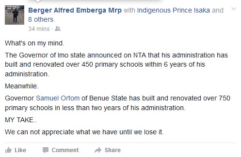 “Meanwhile, Governor Samuel Ortom of Benue State has built and renovated over 750 primary schools in less than two years of his administration,”