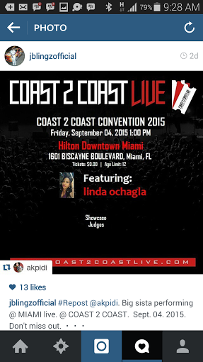 Linda who made a debut in to the Music industry in Nigeria late 2014,will be performing alongside big American artists .She got approval to perform at the Coast 2 Coast Convention Kick Off Party after winning an online contest insearch of Artists to perform at the big event.
