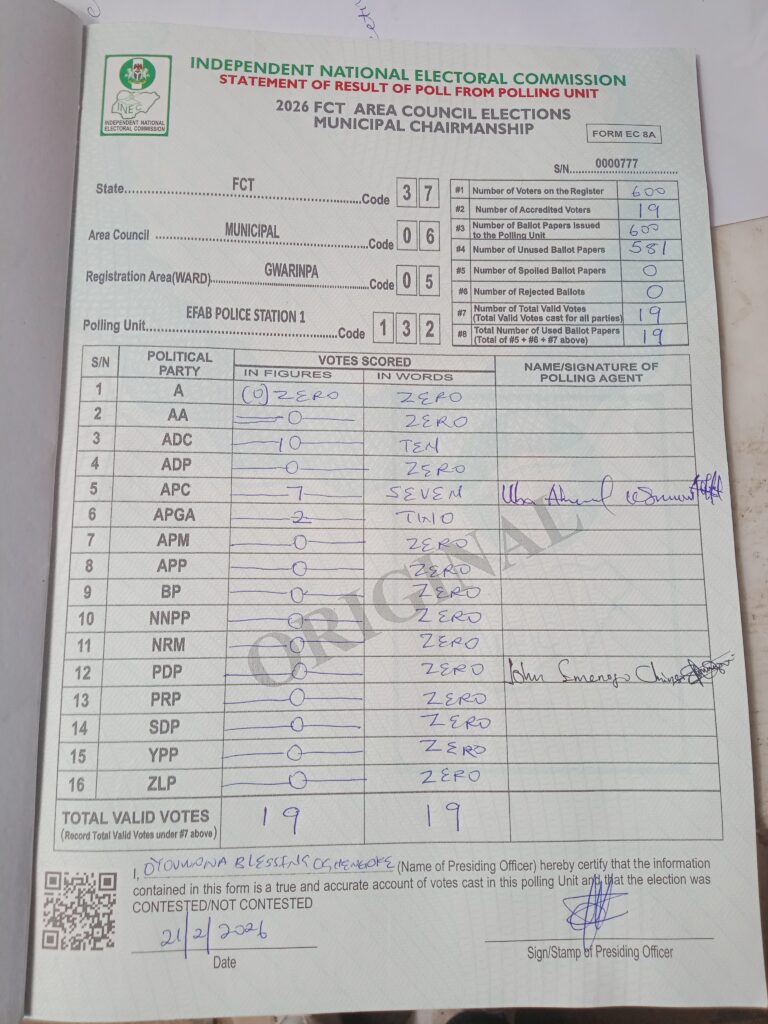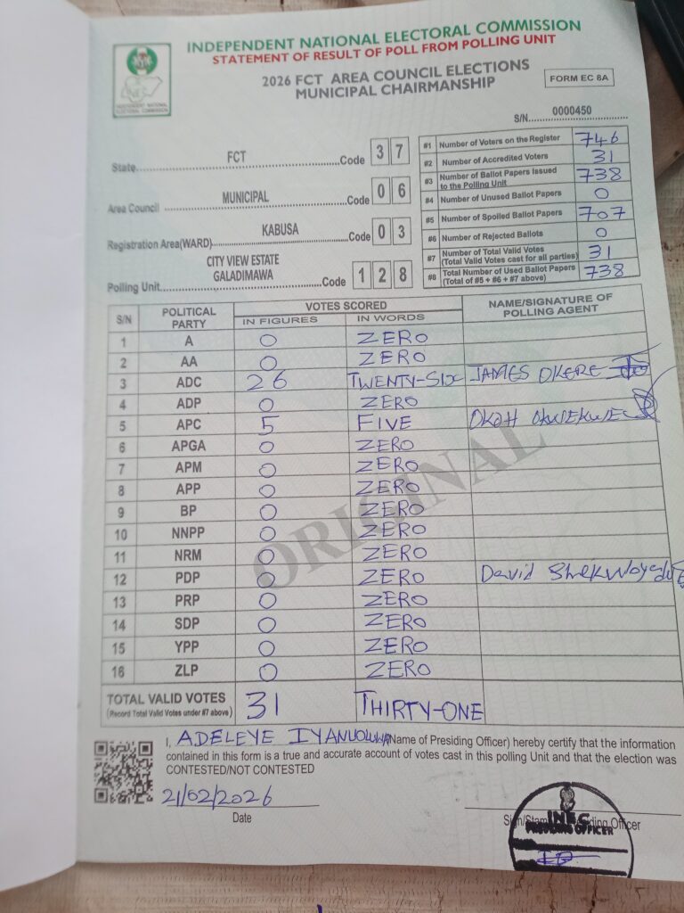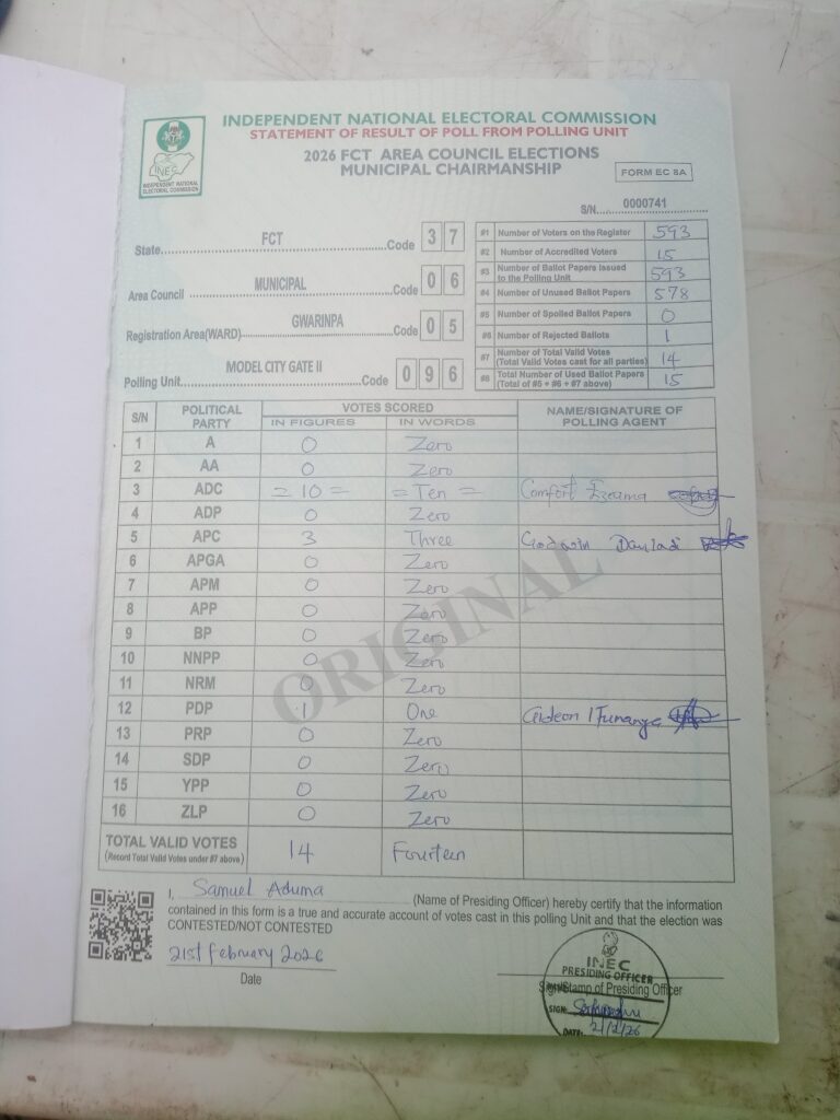 BREAKING: ADC’s Moses Paul wins EFAB Police Station, Model City Gate, City View Estate polling units in Gwarimpa