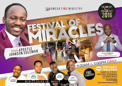 God’s choice servant. The Oracle of our time Apostle Johnson Suleman once again visits the land of South Africa for the festive of miracles.