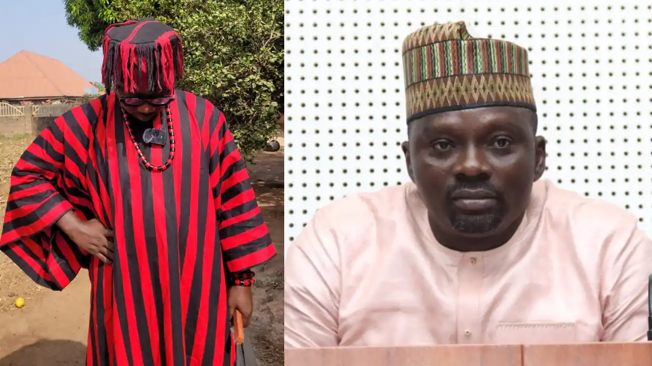 Clad in his native Idoma traditional attire and holding a gong, the outspoken activist said: