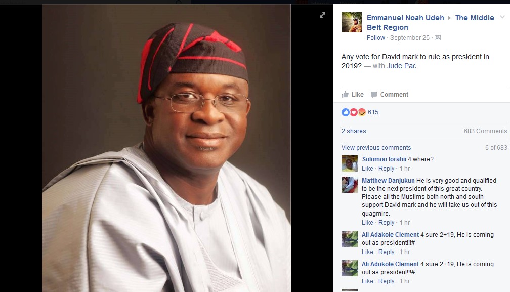 A Facebook user, Emmanuel Noah Udeh who posted the poser on The Middle Belt Region, the largest group of Middlebelters with over 100k members on Facebook asked thus: “Any vote for David mark to rule as president in 2019?”