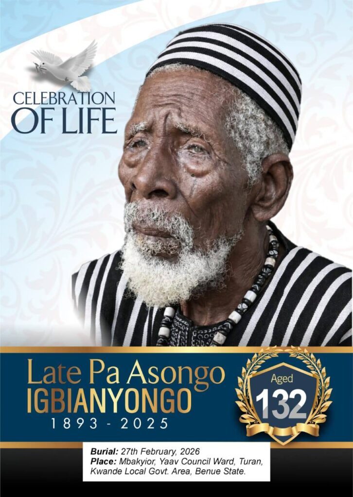 IDOMA VOICE gathered that Pa Asongo died on 21st December 2025 and will be laid to rest on Friday, 27th February 2026, in his hometown of Mbakyior, Yaav Council Ward, Turan.