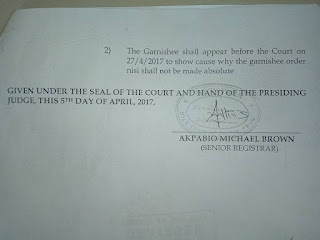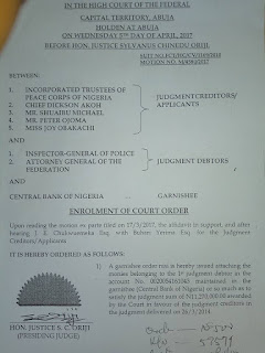 In an enrollment of court order dated March 17,2017, and signed by the judge and the court Senior Registrar, Mr. Akpabio Micheal Brown, the garnishee was issued, so as to satisfy the judgment debt awarded against police and in favour of the creditors comprising Mr Shuaib, Mr Peter Ojoma and miss Joy Obakachi.