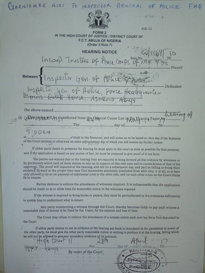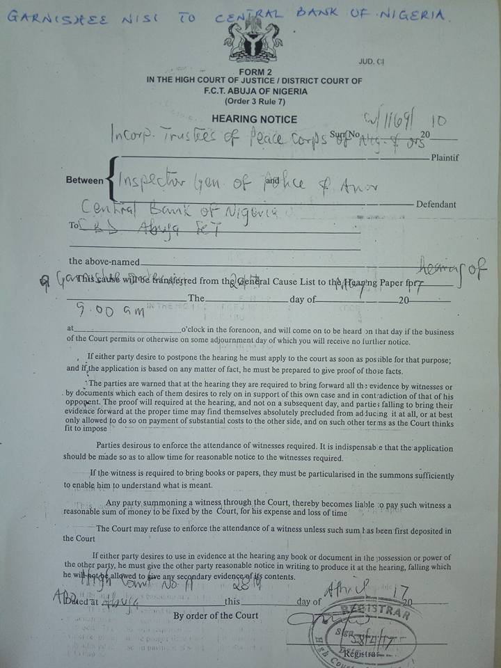 The garnishee order is directing the police to pay the incorporated trustees of Peace Corps of Nigeria and its National Commandant, Ambassador, Dickson Akoh a sum of N11,270,000 from its account with number 0020054161043 maintained at the CBN.