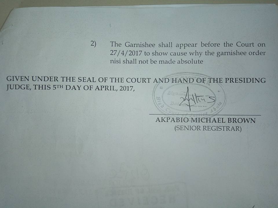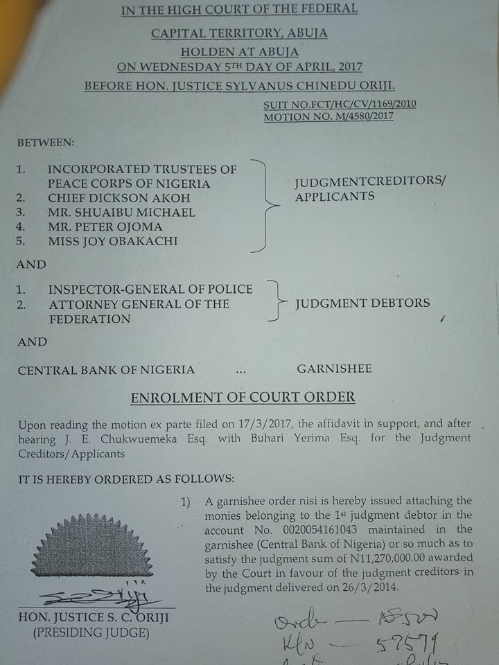 In an enrollment of court order dated March 17,2017, and signed by the judge and the court Senior Registrar, Mr. Akpabio Micheal Brown, the garnishee was issued, so as to satisfy the judgment debt awarded against police and in favour of the creditors comprising Mr Shuaib, Mr Peter Ojoma and miss Joy Obakachi.