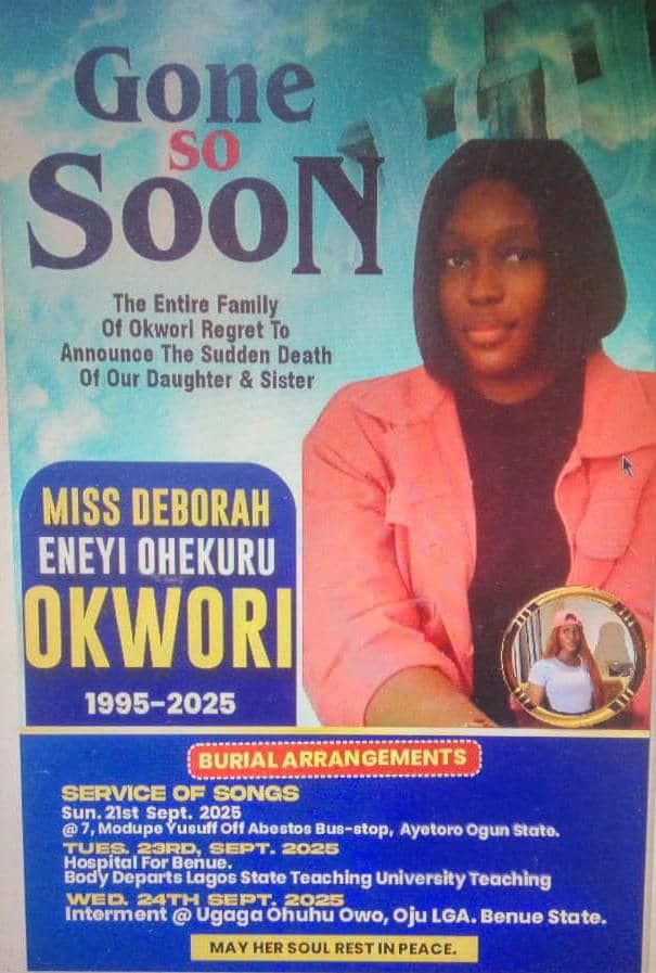 Family members announced that her remains departed the Lagos State University Teaching Hospital on Tuesday, September 23, with interment scheduled for Wednesday, September 24, at Ugaga Ohuhu Owo in Oju Local Government Area of Benue.