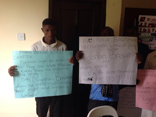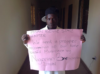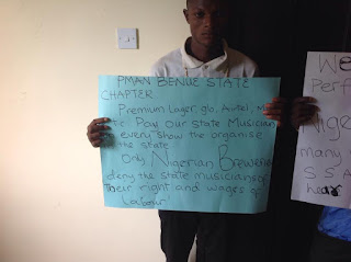 The Musicians under the auspices of Nigerian performing Musicians Association of Nigeria (PMAN), Benue Chapter, numbering over 50 stormed the offices of the SSA on Entertainment, carrying placards with various inscriptions demanding the intervention of the State Government to compel Nigerian Breweries to comply with payment of PMAN Union fees as enshrined in their constitution for Star Trek Music jamboree organized by Nigerian Breweries for the promotion of their beer products.