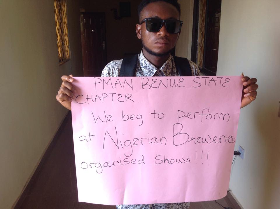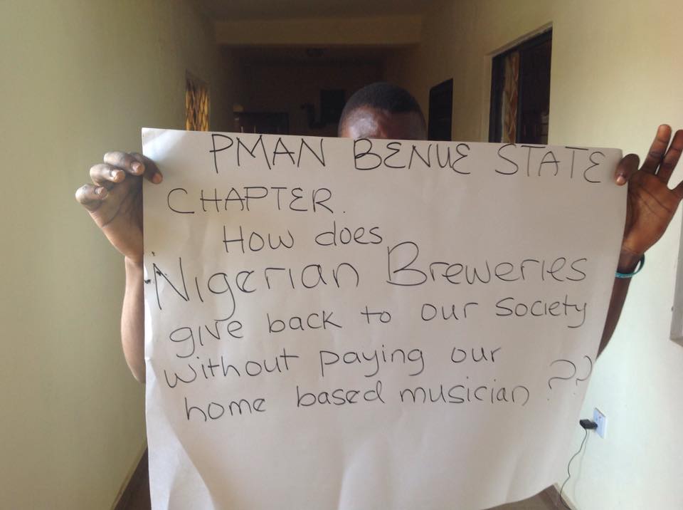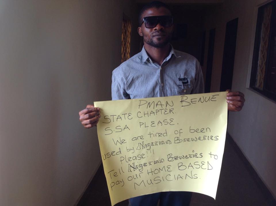 The Musicians under the auspices of Nigerian performing Musicians Association of Nigeria (PMAN), Benue Chapter, numbering over 50 stormed the offices of the SSA on Entertainment, carrying placards with various inscriptions demanding the intervention of the State Government to compel Nigerian Breweries to comply with payment of PMAN Union fees as enshrined in their constitution for Star Trek Music jamboree organized by Nigerian Breweries for the promotion of their beer products.