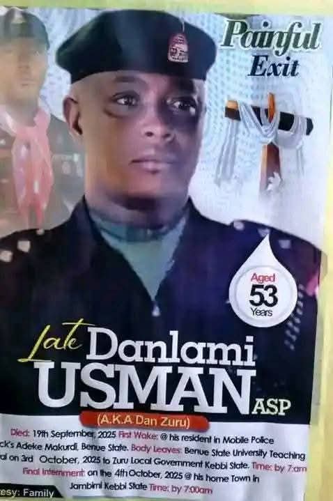 A wake-keep was earlier held at his residence in the Mobile Police Barracks, Adeke, Makurdi, before his body was conveyed from the Benue State University Teaching Hospital on October 3, 2025, to Kebbi for interment.