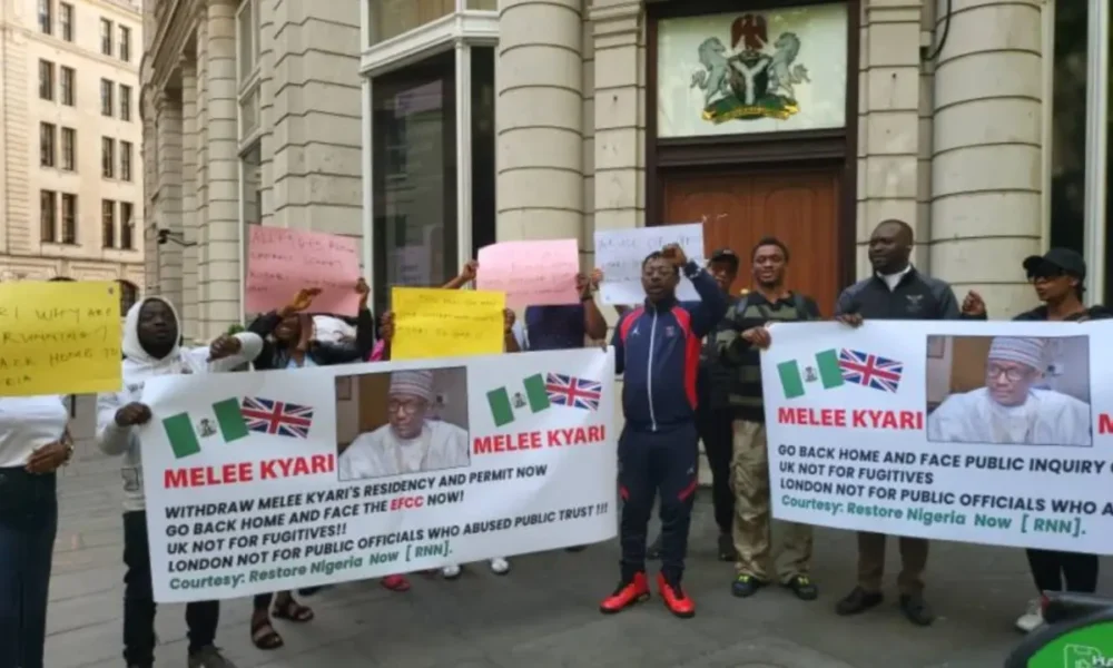 Hundreds of Nigerians stormed the Nigerian High Commission and the UK Home Office in London on Monday, May 12, 2025, demanding that former NNPCL boss Mele...