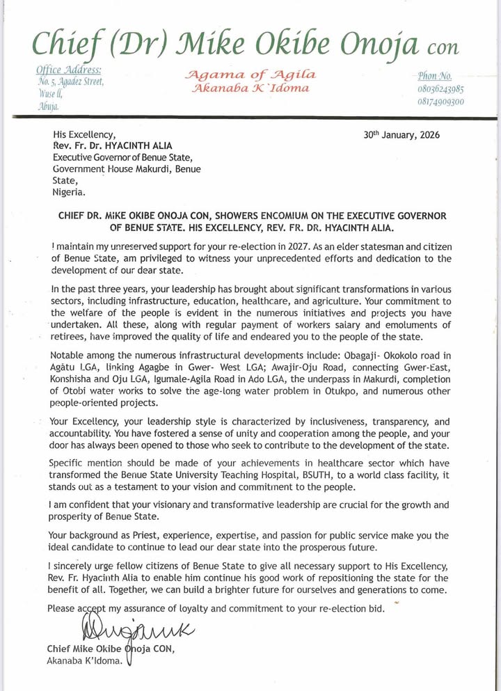 “As an elder statesman and citizen of Benue State, I am privileged to witness your unprecedented efforts and dedication to the development of our dear state. I maintain my unreserved support for your re-election in 2027. As an elder statesman and citizen of Benue State, I am privileged to witness your unprecedented efforts and dedication to the development of our dear state,” Chief Onoja wrote.